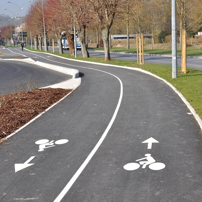 - Aménagement piste cyclable : par le tracé de lignes continues et l’adjonction de logos cyclistes et flèches ou un projet plus élaboré avec une piste cyclable tout en résine toujours accompagnée des logos.