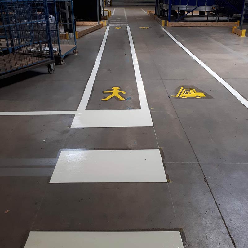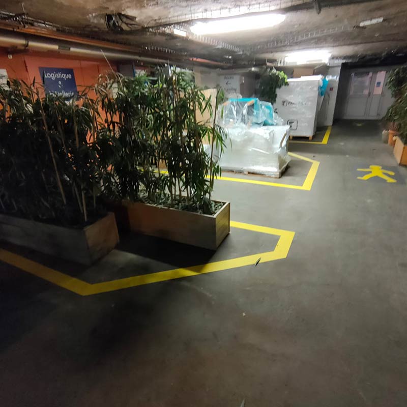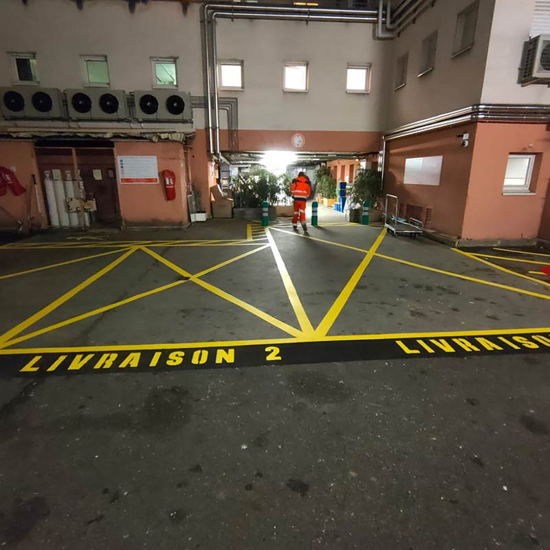 Le marquage au sol avec des résines à froid ou des thermocollés préformés garantit une visibilité optimale, même sous des conditions climatiques extrêmes.